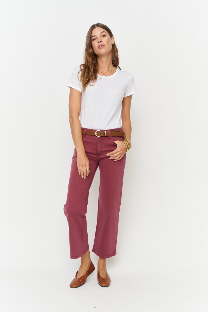 - Mid rise, fitted through the hip with a zipper fly––detailed with a finished hem and ankle slit.