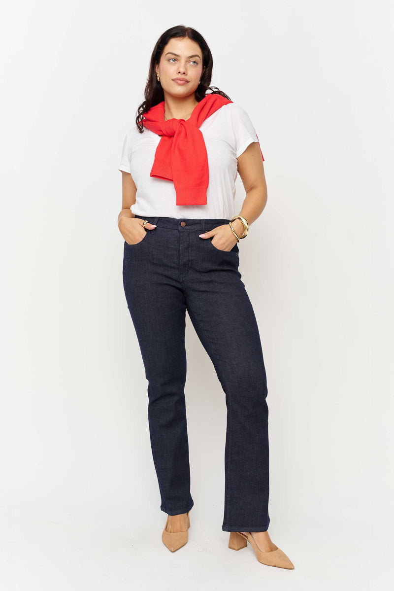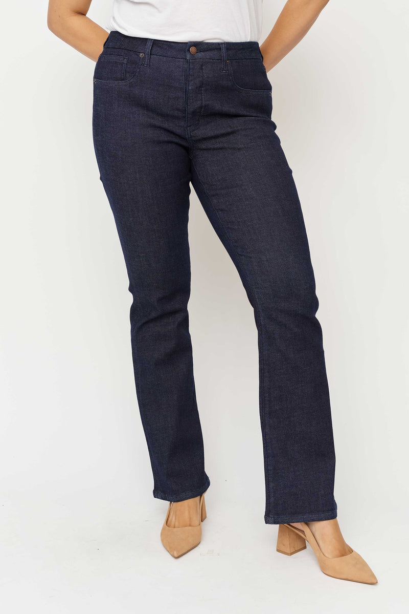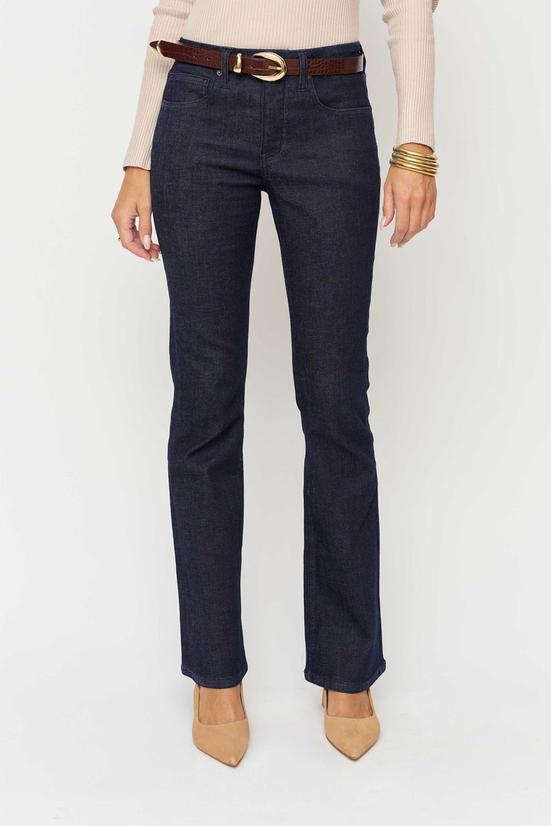 • Mid-rise boot cut with a slim thigh and gentle flare designed to elongate your legs