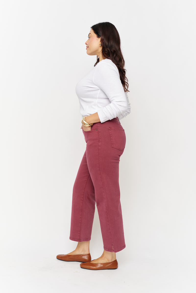 - Mid rise, fitted through the hip with a zipper fly––detailed with a finished hem and ankle slit.