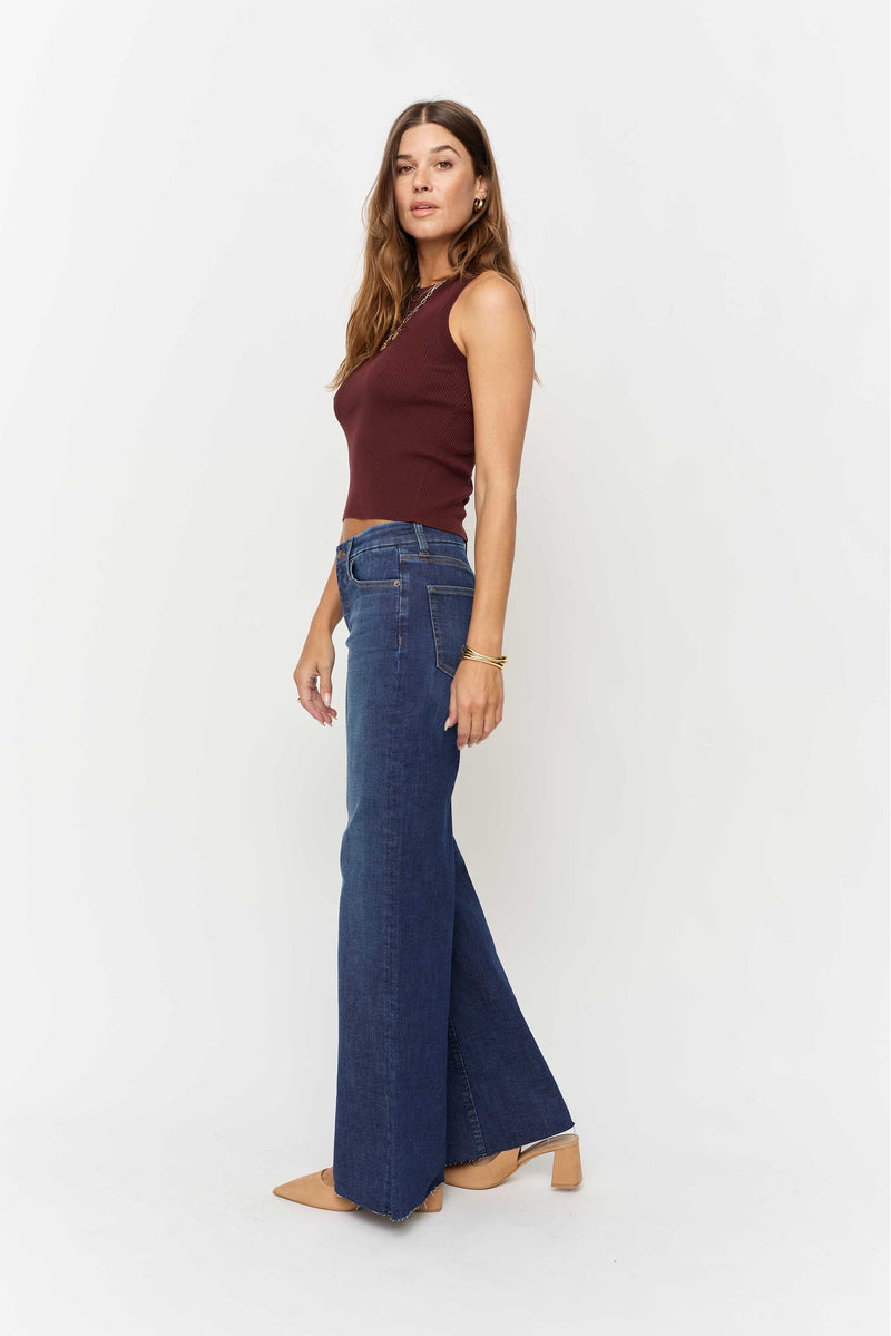 - Fitted through the hip with a full, floor-grazing wide leg and raw hem.