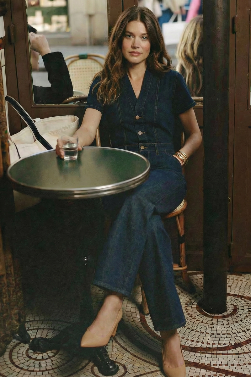 - Short sleeve denim coverall with a v-neckline, button closure, and a cropped wide-leg.