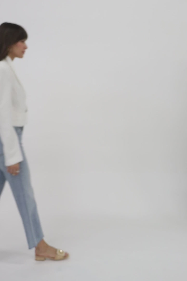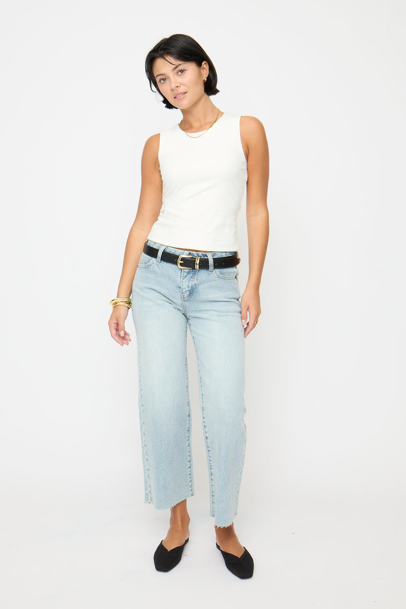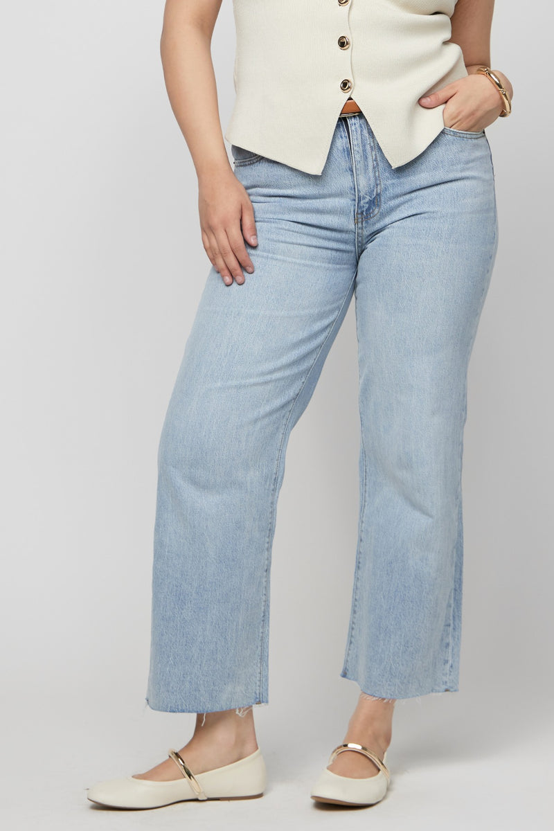 - High rise, fitted through the hip, zipper fly, wide leg, and a cropped raw hem.