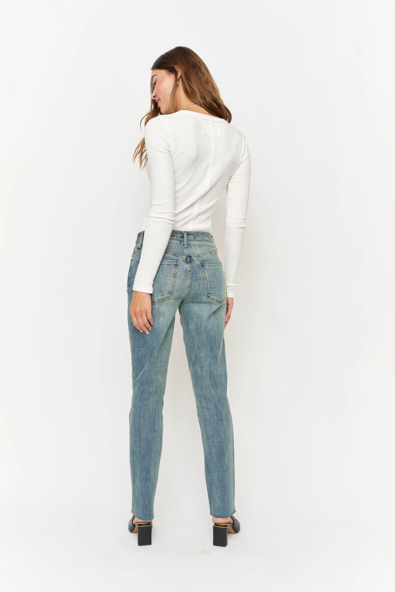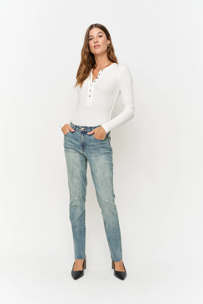 Mid-rise with perfectly balanced stretch. Chic yet casual with a raw hem to finish.