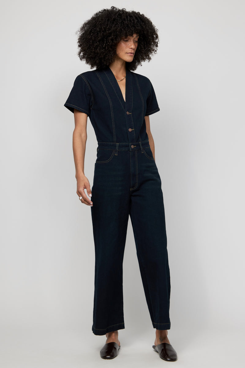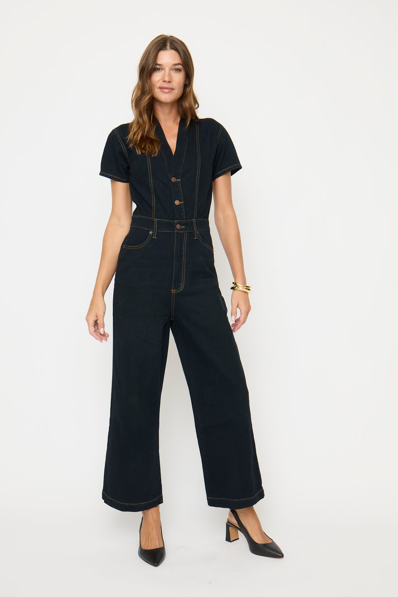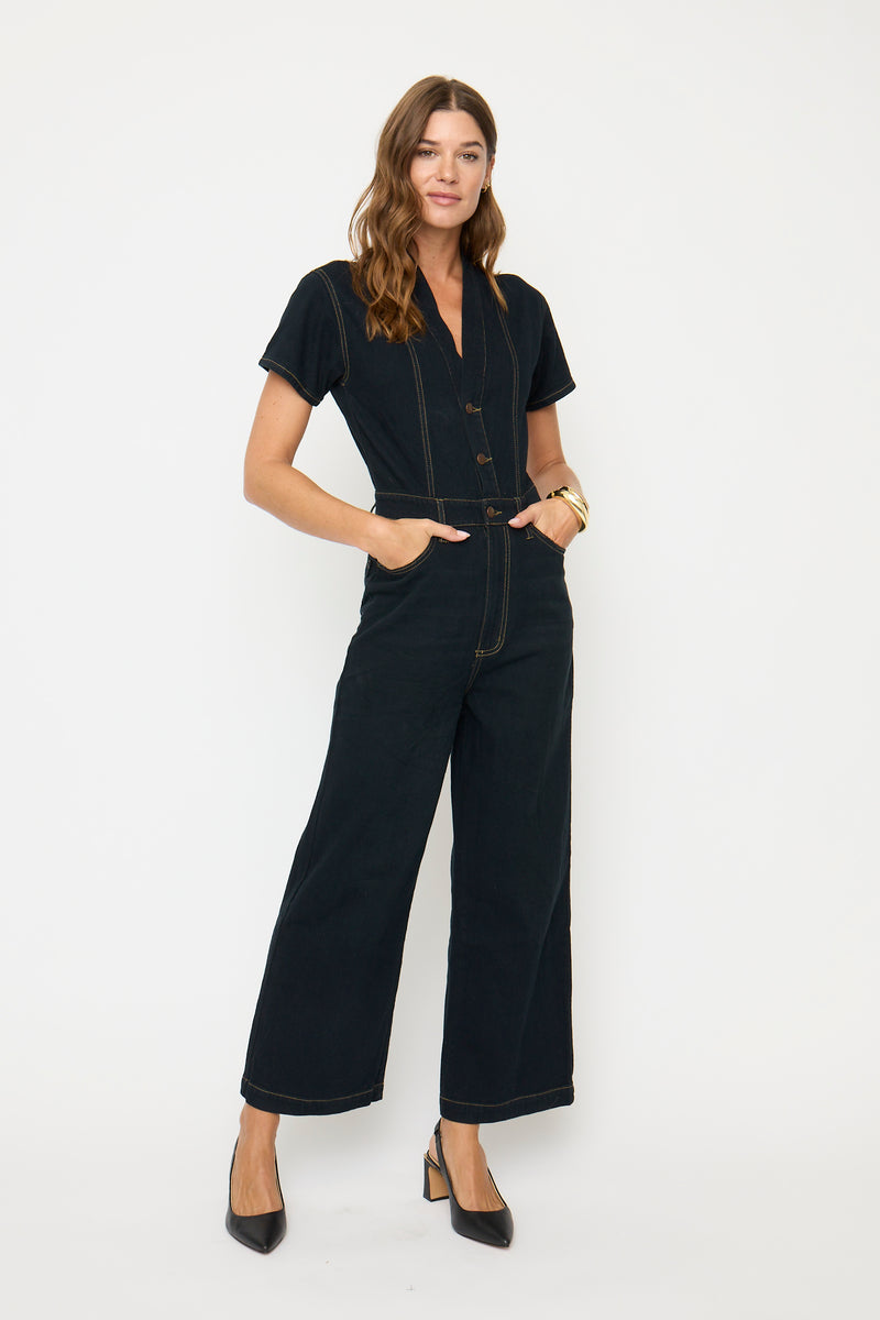 - Short sleeve denim coverall with a v-neckline, button closure, and a cropped wide-leg.