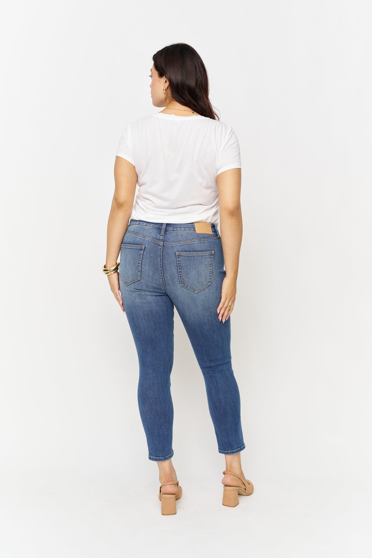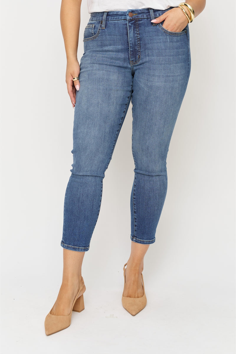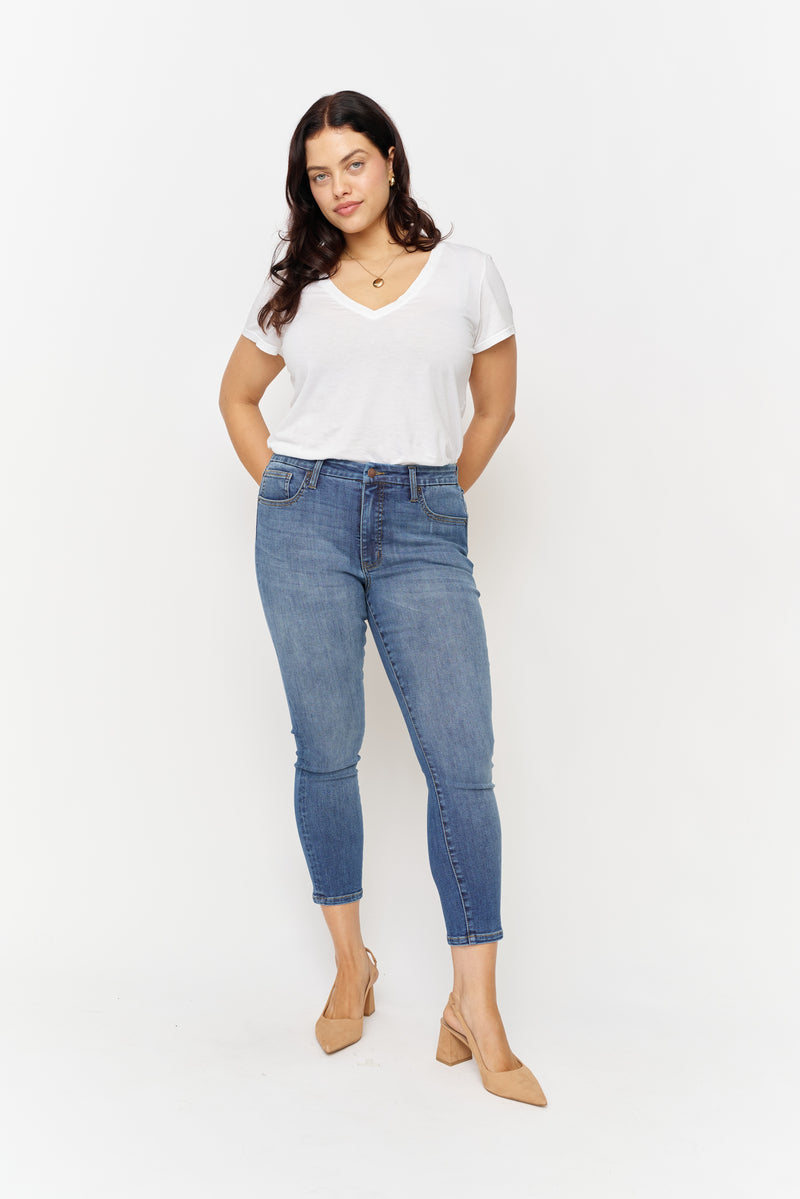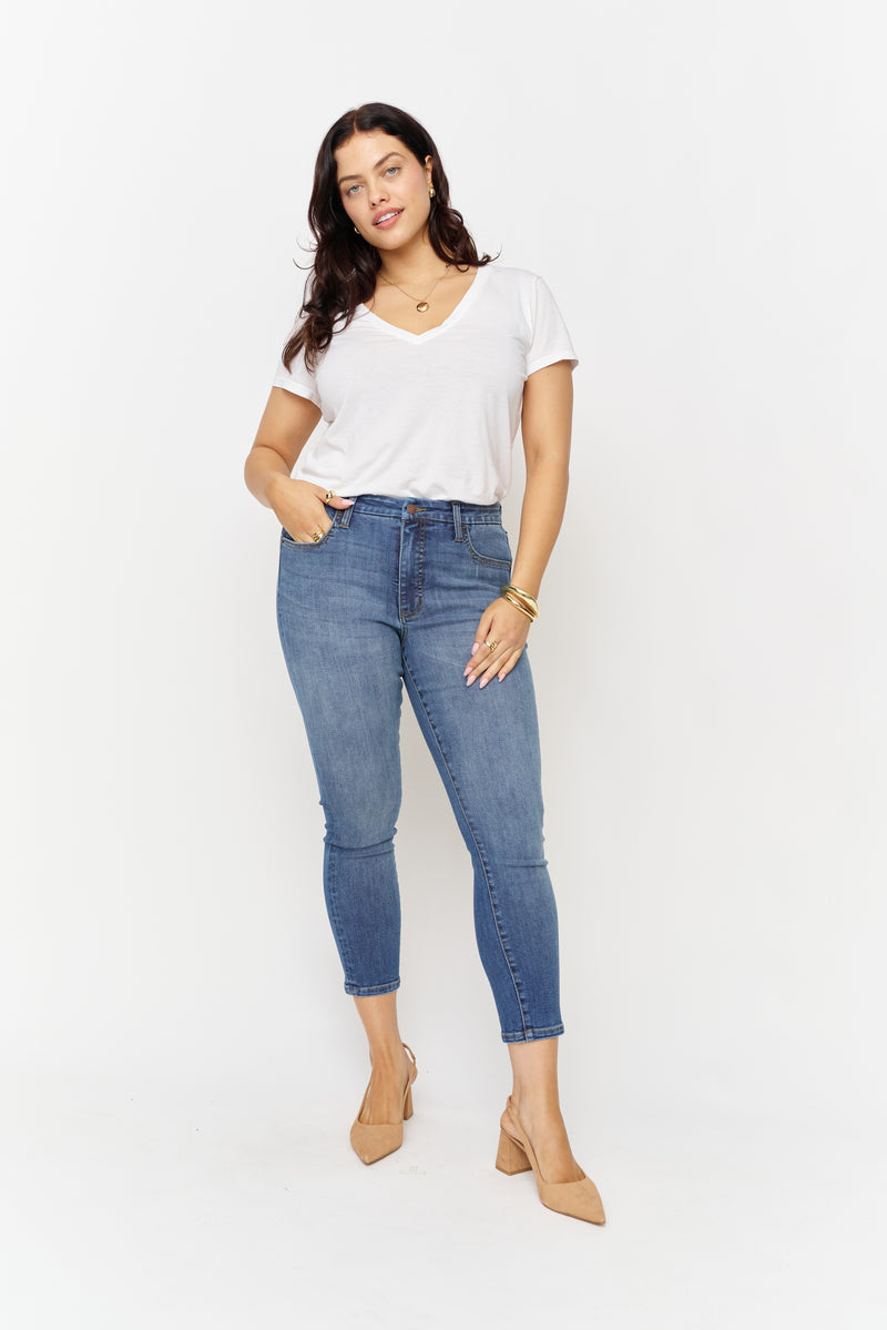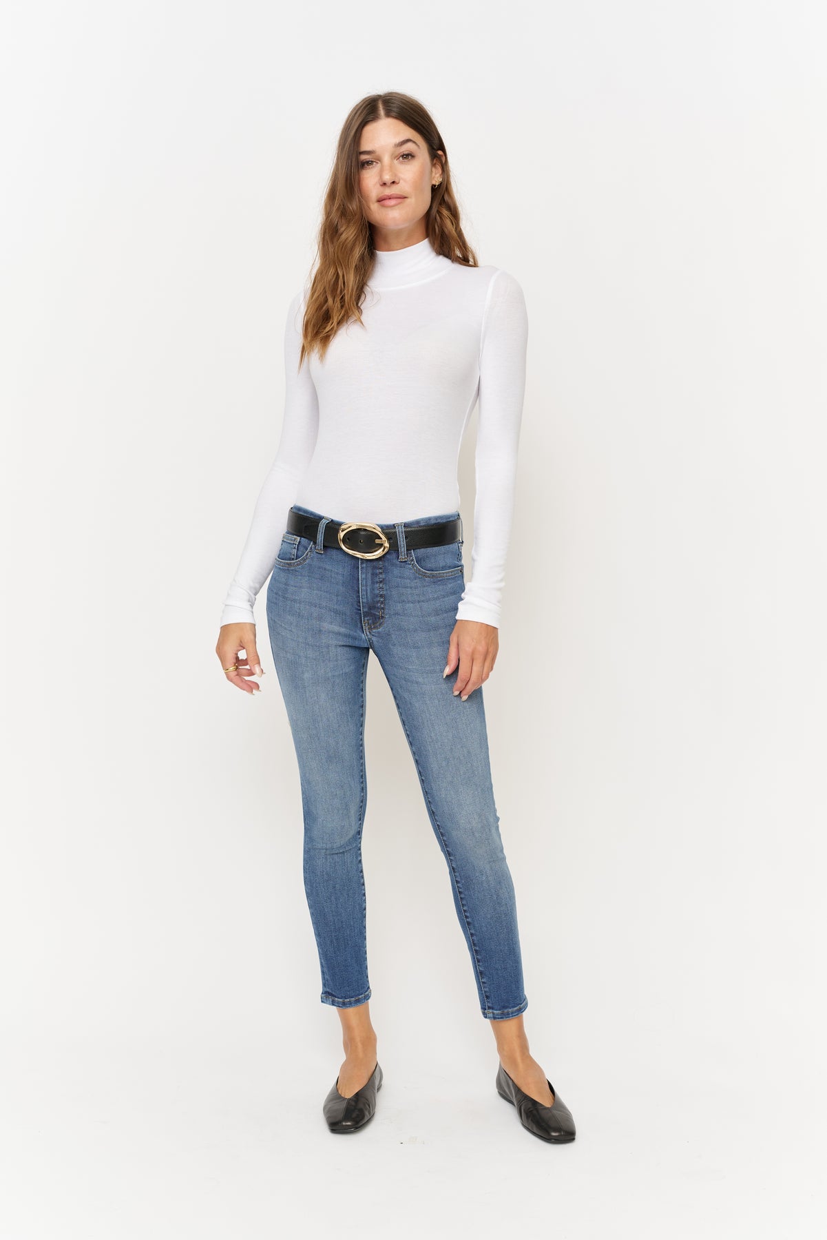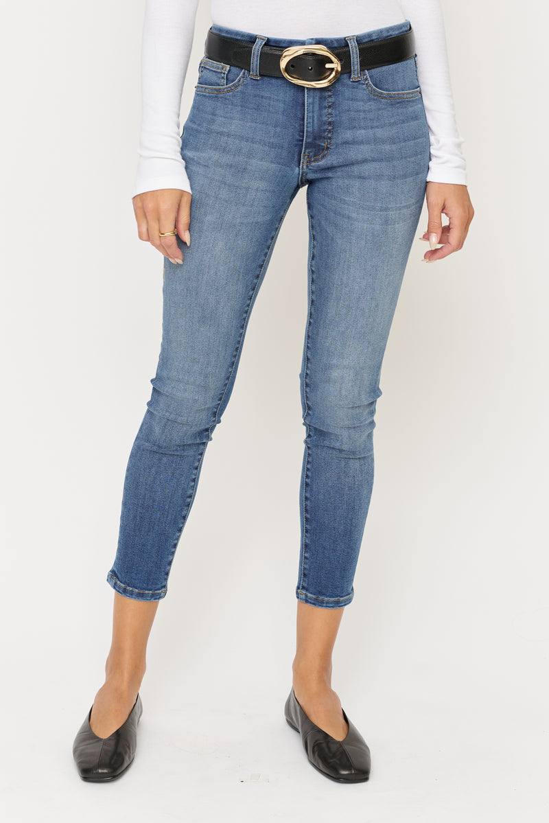 - Soft, stretchy denim with a tummy-smoothing rise and a leg-lengthening crop that feels like a second skin.