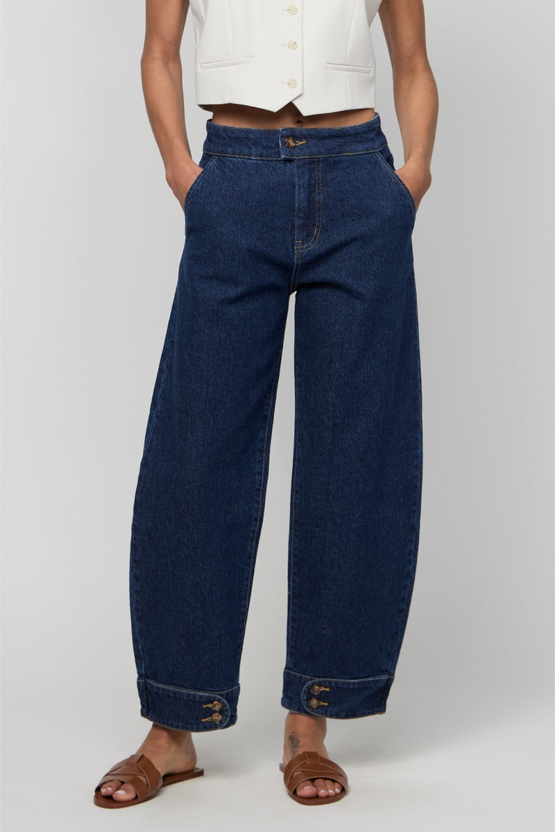 - High rise with a true yet understated balloon-leg shape, deep patch pockets with a button accent at the hem.