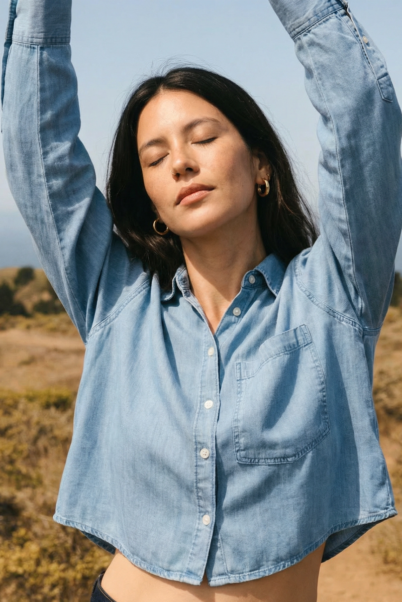 - Button-up denim shirt with a buttery-soft feel, classic chest pocket, and a high-low cut.
