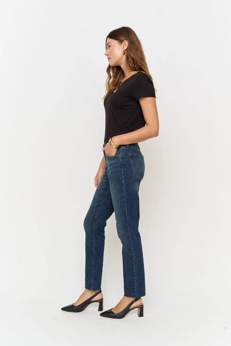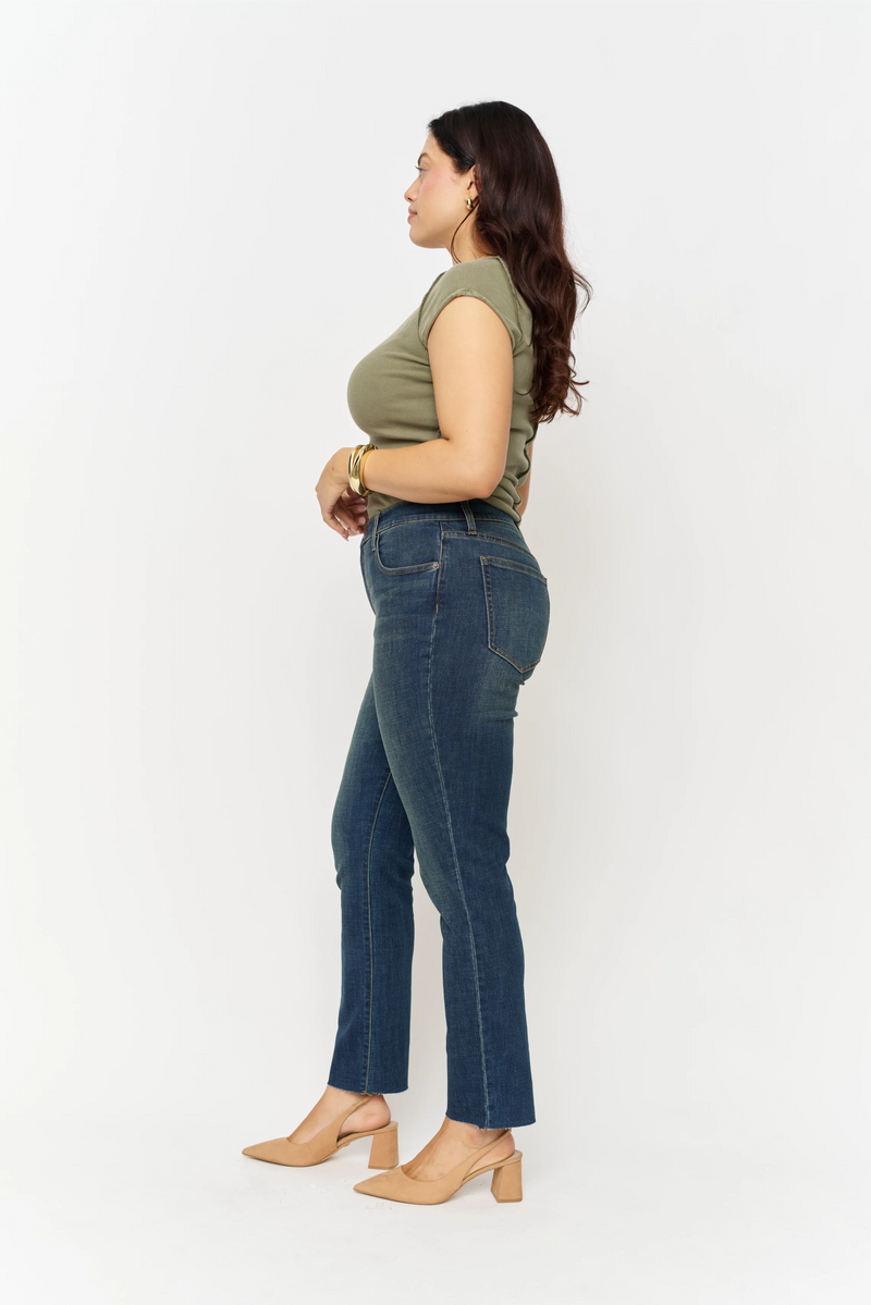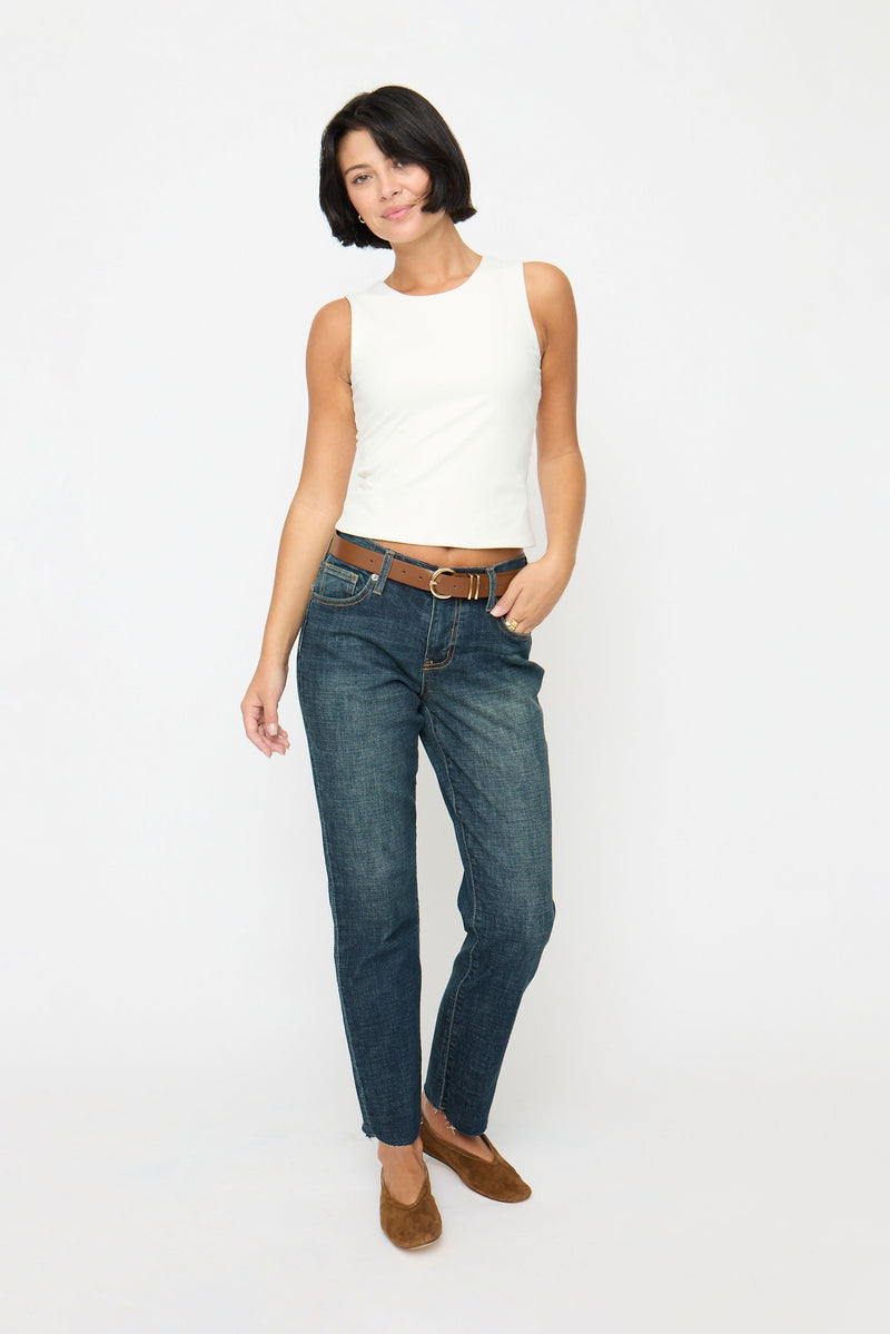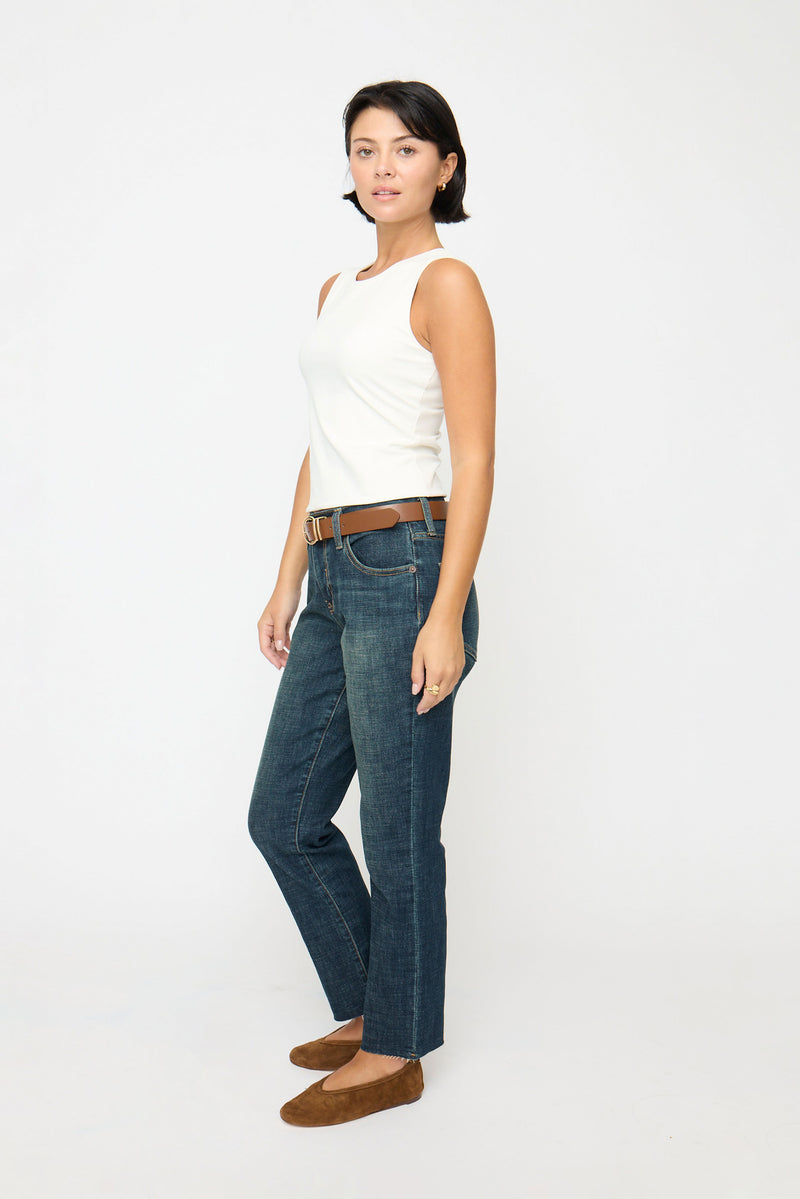 Mid-rise with perfectly balanced stretch. Chic yet casual with a raw hem to finish.
