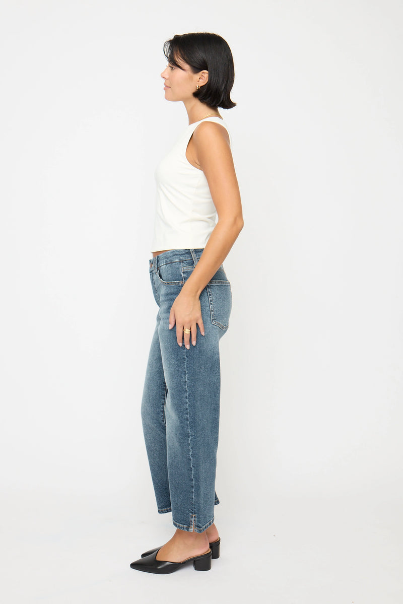 - Mid rise, fitted through the hip with a zipper fly––detailed with a finished hem and ankle slit.