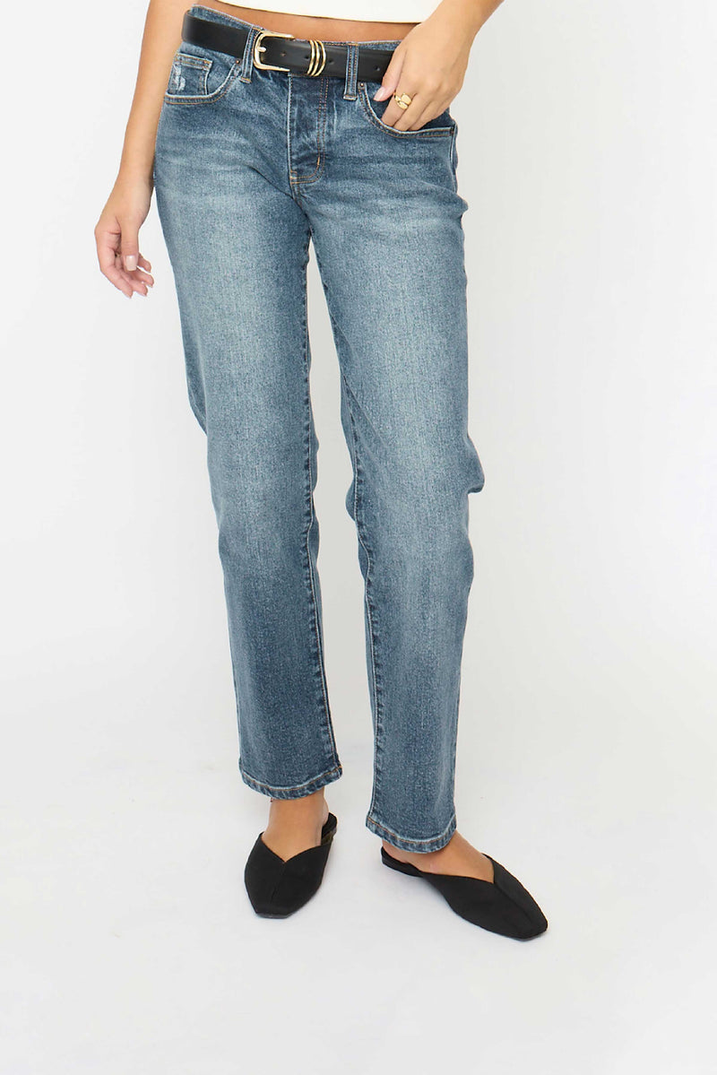 - Slim fit, low-rise jeans with a vintage button fly and a sleek, finished hem.