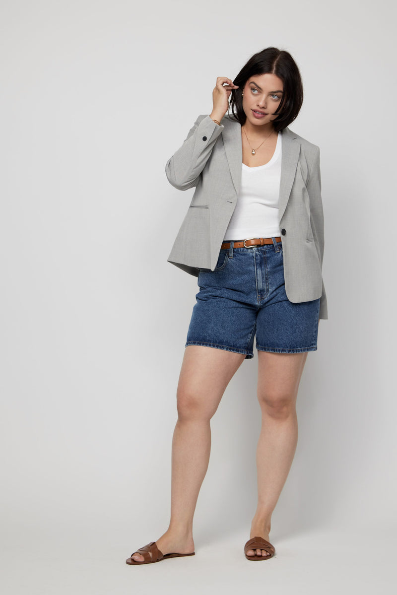 - High-rise long shorts with a zipper fly, finished hem, real pockets, and boxy-structured open leg.